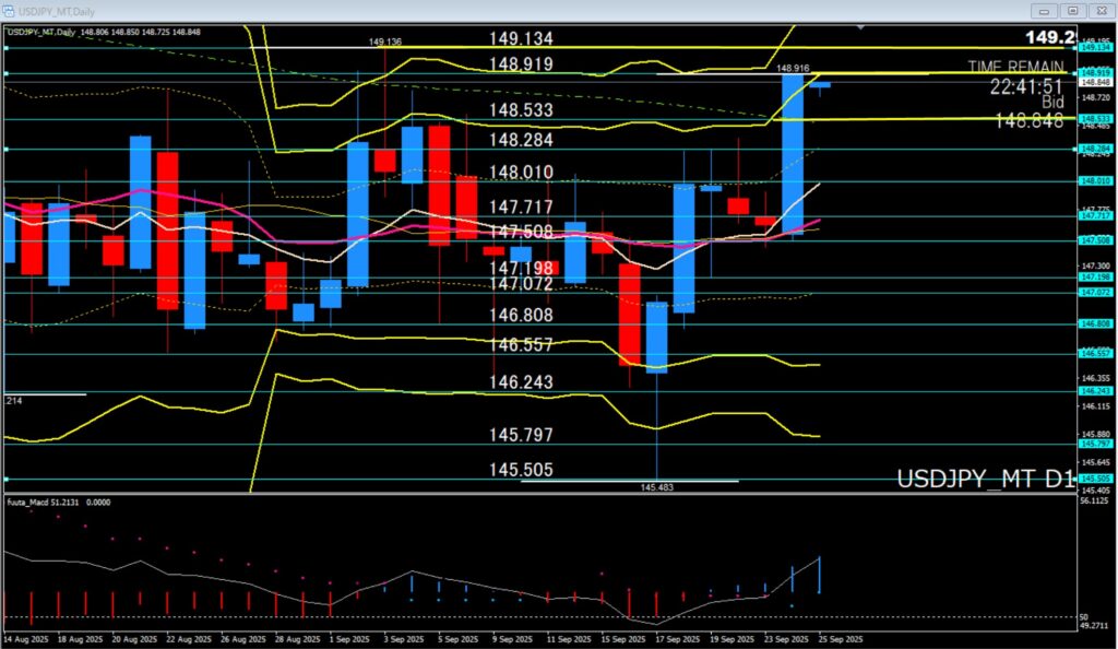 日足だと、昨日は147円中盤で下げ渋りじりじりと上昇、148円台に乗せてくると円安が強まり148円90付近まで上昇する展開。