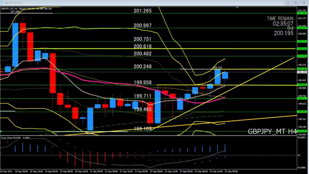 4時間足だと、ボリンジャーバンドと移動平均線線が上向き、買い優勢になってきていますので「横ばいから上目線」ですが、朝の状況だとボリンジャーバンドの+2σが200円20付近にあり上値が重くなっています。4時間足だけで見たら下げても押し目買いでいいかなと考えていますが値幅があまりないので200円00付近から199円90付近が次のサポート!