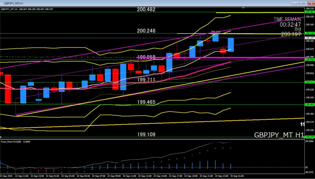 60分足だと、ボリンジャーバンドと移動平均線が上向き、じり上げ展開でやり辛そうですね!7時台が陽線で確定してますので200円10から08付近サポートで上目線ですが、200円20付近で上値が重いと下落してきそうです。ドル円との兼ね合いを考えると難しいですね!