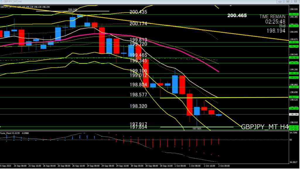 4時間足だと、ボリンジャーバンドが下向いていて、かつ、バンドウォーク展開になっていますので「横ばいから下目線」が継続、朝は下げ渋って上昇してきていますので198円30付近を超えてきたら一旦は買戻しの展開となりそうで、198円45付近、198円55付近が上値ポイント!