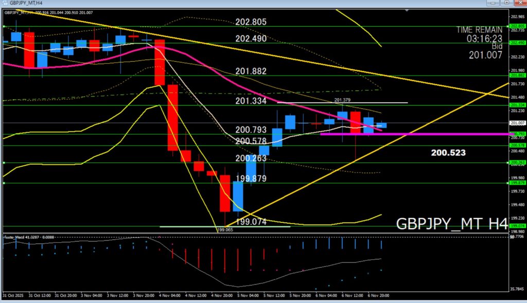4時間足だと、ミドルライン付近で膠着状態、朝の時点だとミドルラインのある200円90付近でサポートされていますが下抜けそうです。ただ下げても売りが強まらなければ支持線のトレンドラインのある200円50付近でサポートされる可能性もありどうなるか!?下げ止まれば三角持ち合いになる可能性も!