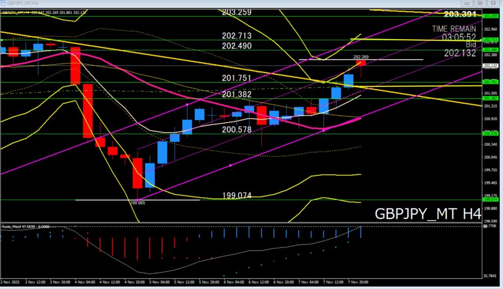 4時間足だと、ボリンジャーバンドがエクスパンションの流れ、朝の時点だと買い優勢でどこまで伸びるか!「横ばいから上目線」、202円30から80付近は過去に揉み合ったゾーンですので戻り売りには警戒!