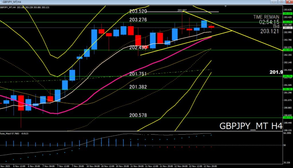 朝の時点だと上値が重そうで調整展開に注意、203円00付近から202円90付近でサポートされるか?割り込んだら203円中盤付近までの下落に注意!