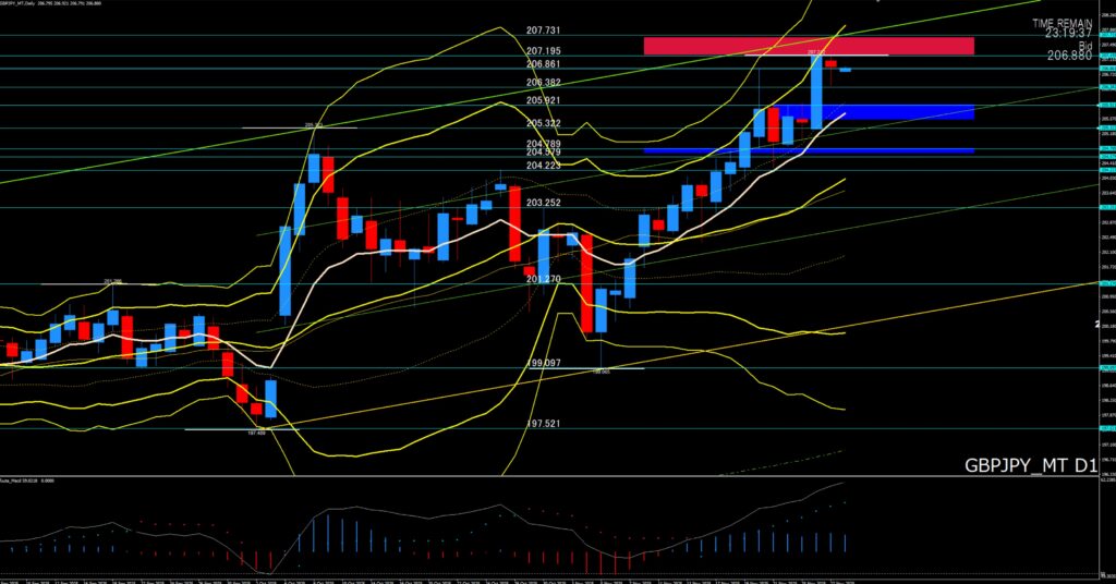 ②「トレード戦略」⇒買い優勢の展開も207円台では上値が重くなっていますので週末での調整売りに注意!