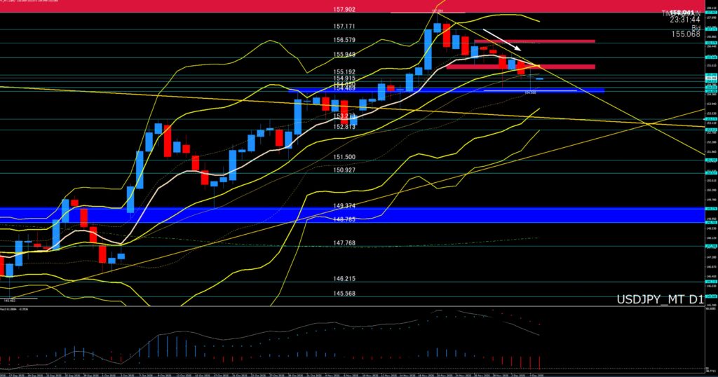 ②「トレード戦略」⇒本日はゴトー日ですので実需買いなどがはいれば一旦は155円中盤付近まで戻りを試す局面もあるかもです。上値ポイントで上値が重くなったら戻り売りで押し目買いは反発がなければ注意!
