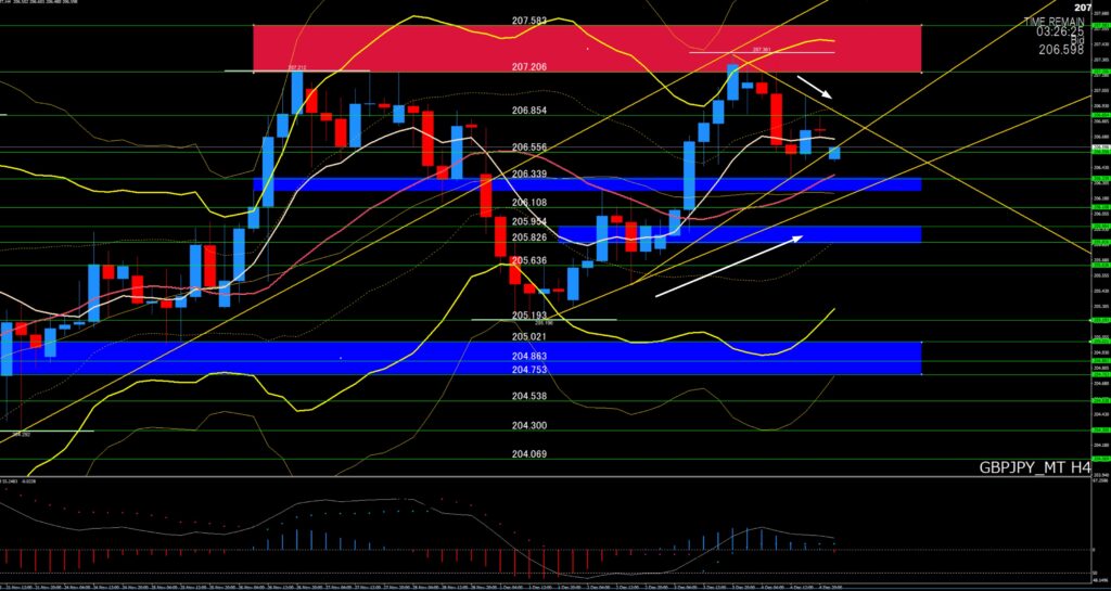 ②「トレード戦略」⇒4時間足だと高値切り下げていますが売りがあまり出ていない印象、三角持ち合いから下抜けしていますので「横ばいから下目線」ですが売りが強まらなければミドルライン付近(206円35付近)で下げ止まる可能性もありそうです。