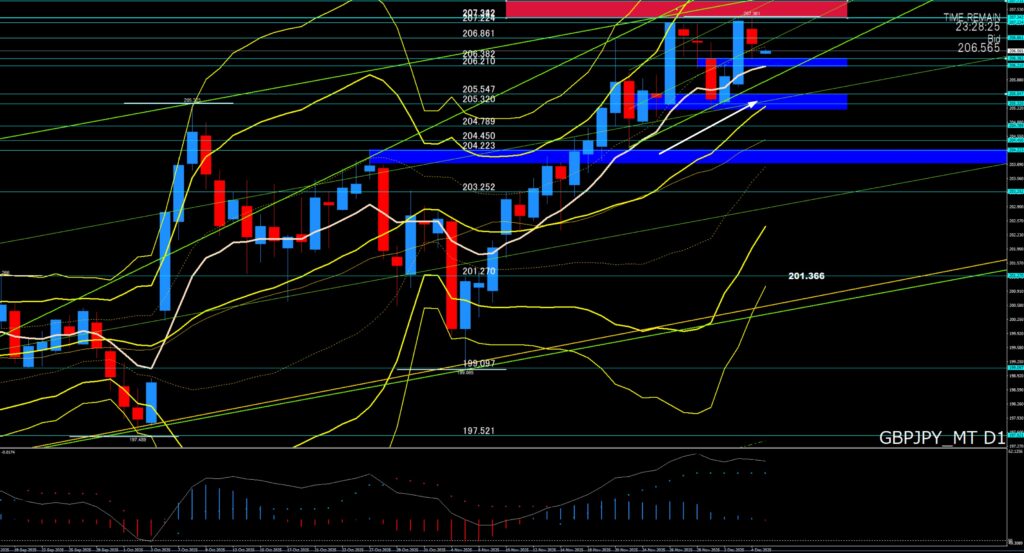 ②「トレード戦略」⇒昨日ダブルトップポイントの207円36付近で上値が重く売りが出るもそれほど売りが出ていないのでまだ上値を狙っている可能性もあり206円15から00付近でサポートされていれば「横ばいから上目線」で考えています。
