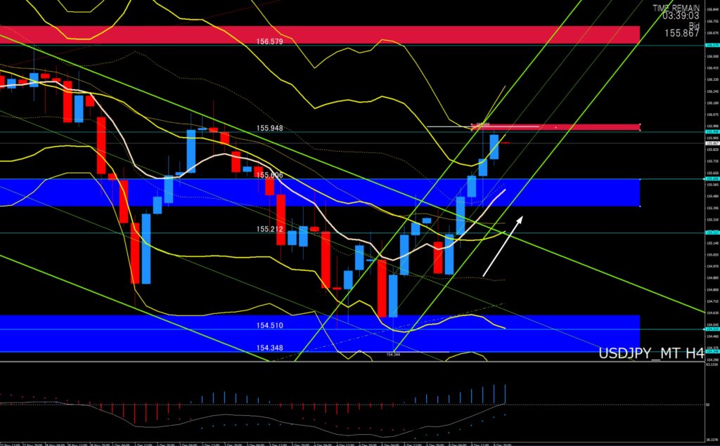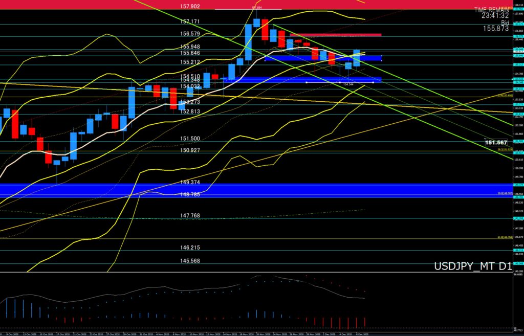 ②「トレード戦略」⇒155円70付近サポートで上目線、買戻しの展開、ただ上昇しても上値ポイントでは戻り売りに警戒、日足の上値ポイントは156円00付近、156円20付近、156円59付近