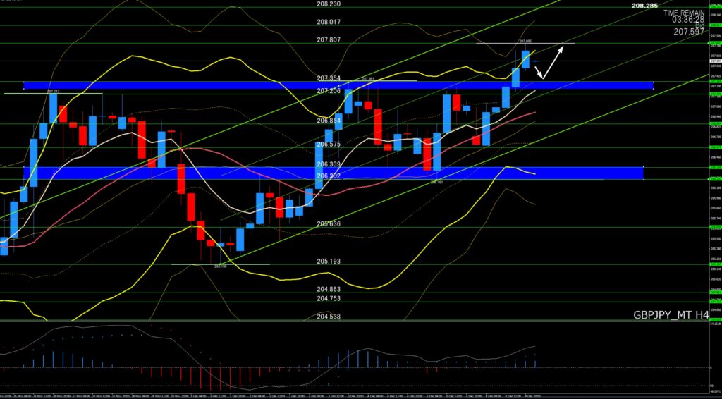 ②「トレード戦略」⇒日足と4時間足では買い優勢の展開、上目線、ぐいぐい上げるというよりはじりじりと上げていく展開、本日は下げたら下値ポイントでは押し目買い狙い!208円台乗せてくれば208円40付近まで上昇する可能性有り!