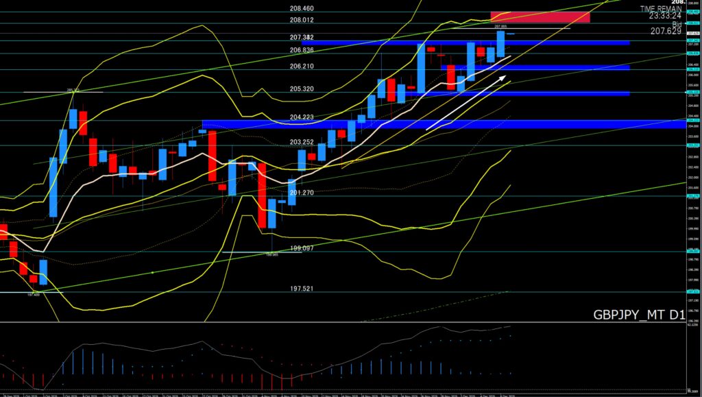 ②「トレード戦略」⇒ボリンジャーバンドがエクスパンション、+2σに張り付いていて買いが強い状況、朝の時点だと+2σが207円73付近が抵抗線、下げなければ上抜け、下げてきたら調整で207円前半までの下落に注意!