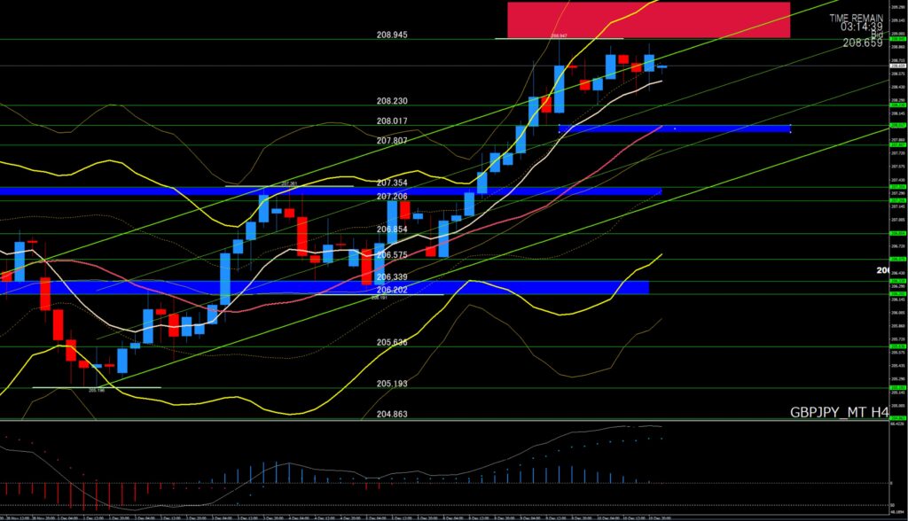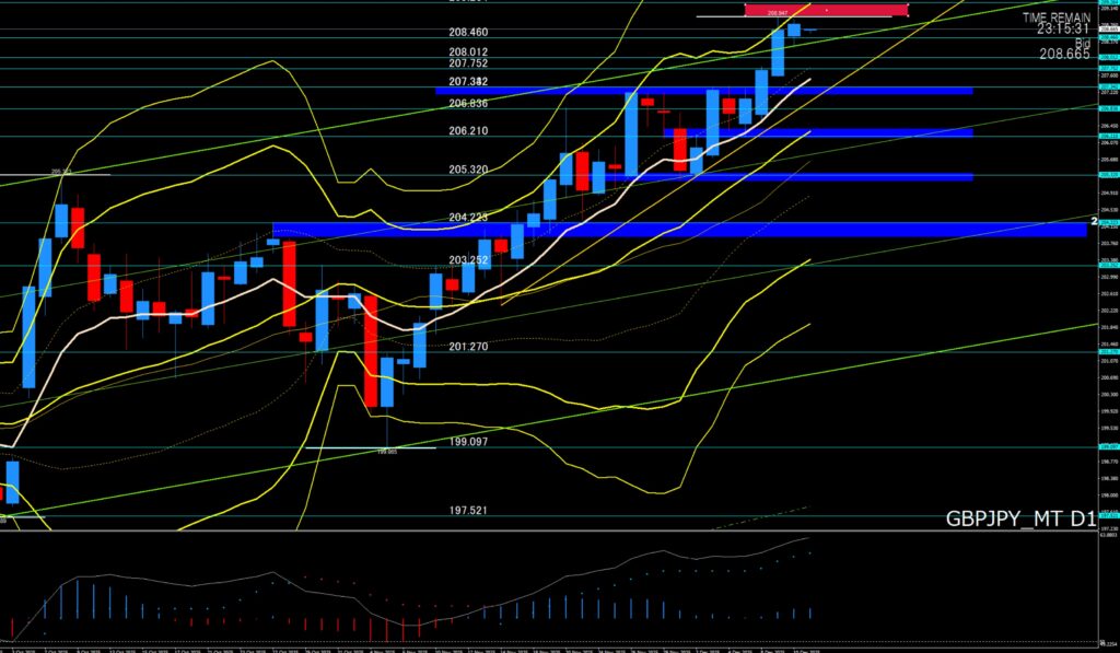 ②「トレード戦略」⇒日足では高値圏で下落すると208円00付近、207円後半まで下落する余地があります。高止まりしていればそのまま209円台目指す展開になる可能性もあり!他の時間軸で下値ポイントを判断して押し目買い狙い!