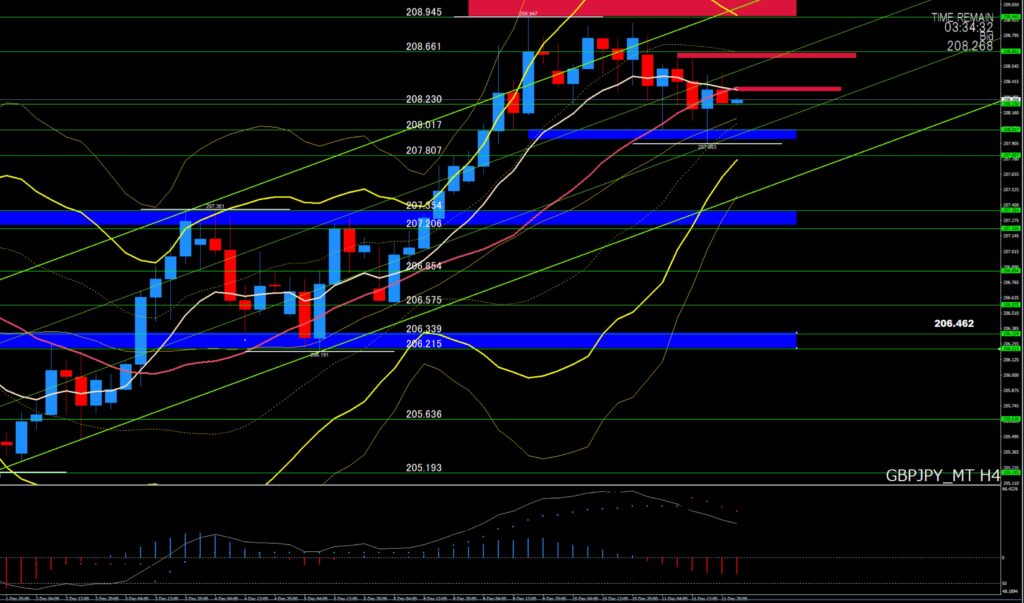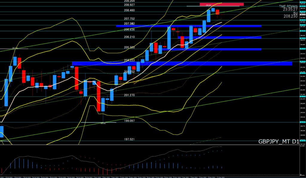 ②「トレード戦略」⇒208円35から40付近が抵抗線で下目線、超えて上昇しても上値ポイントでは戻り売りに注意、すんなり下げても208円05から00付近でサポートされる可能性!