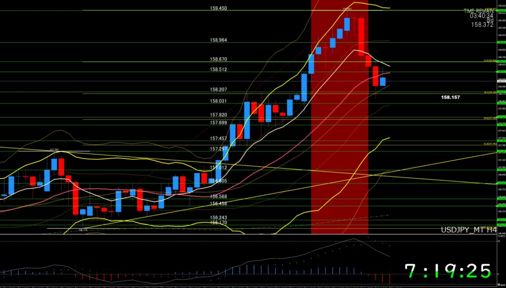 ③「注目レート」⇒(上値ポイント:158円50付近、158円60から67付近、158円95付近、下値ポイント:158円30付近、158円20付近、158円00付近、157円80付近、157円70から60付近)