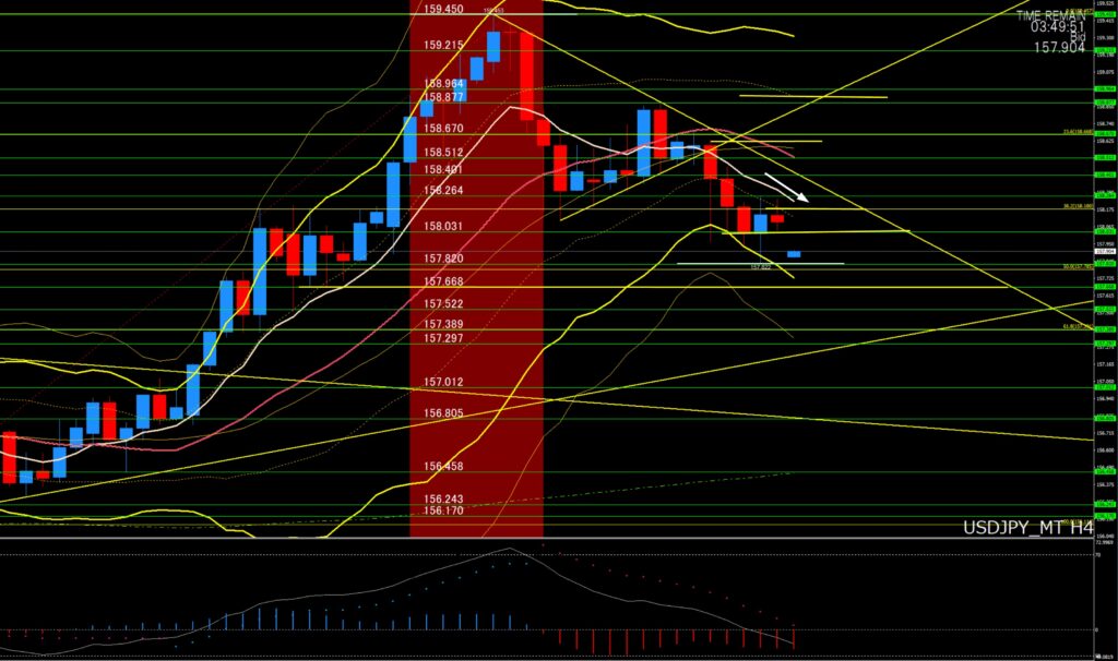 ③「注目レート」⇒(上値ポイント:158円00付近、158円10付近、158円18付近、下値ポイント:157円85から80付近、157円55から50付近、157円30付近、157円20付近、157円10から00付近)