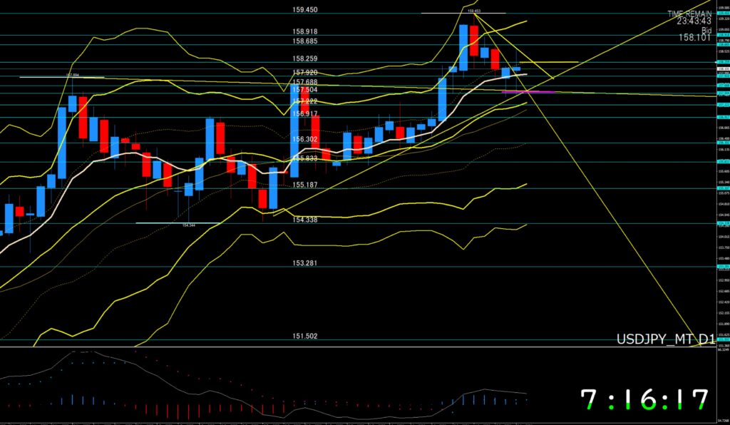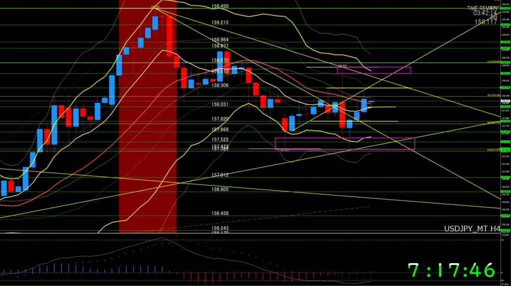 ③「注目レート」⇒(上値ポイント:158円25から28付近、158円40付近、158円60付近、158円70付近、下値ポイント:158円00付近、157円80付近、157円60付近、157円50付近)