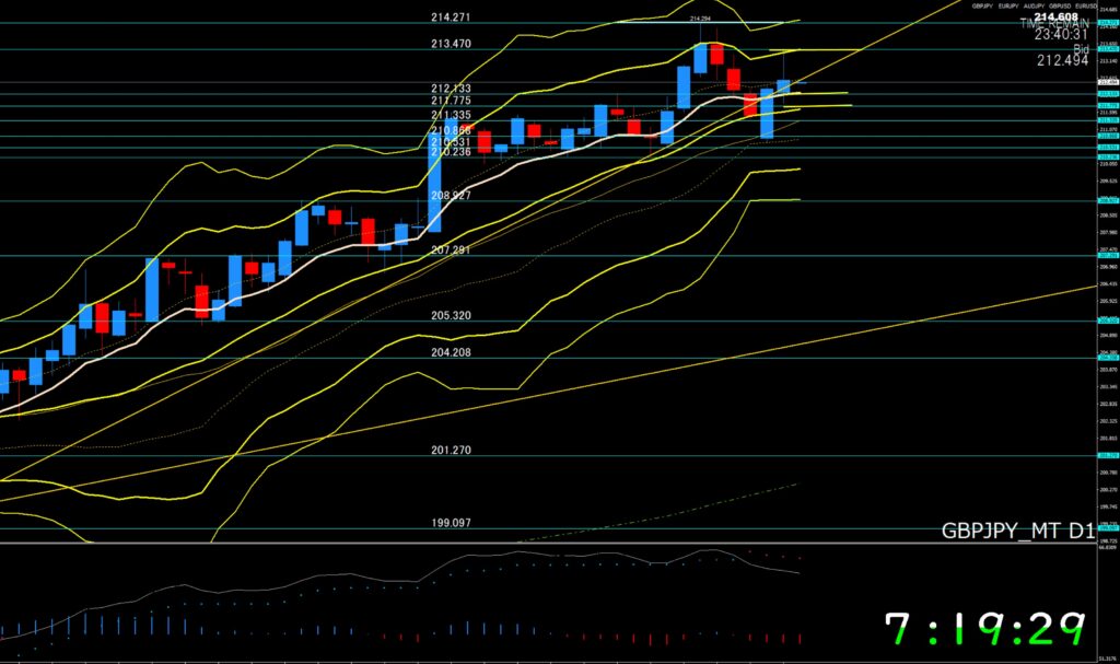 ②「トレード戦略」⇒ボリンジャーバンドの+2σ(212円後半付近)何度も到達しても売りが少な目、今度は上にエクスパンションを狙ってそうで上目線ですので押し目買い、売りが出て212円40付近を割り込んでしまうと売りにシフト