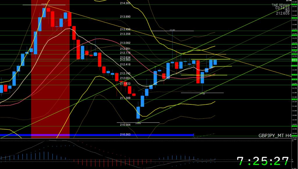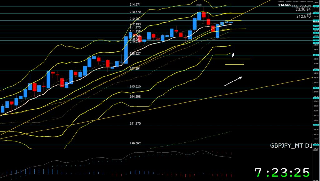 ②「トレード戦略」⇒日足だと212円20台がサポート、抵抗線が212円65付近、この間での値動きを意識して上目線、サポートまで下げてからの反発か?そのまま上抜けか?4時間足、60分足の状況を加味して攻めたいところ!