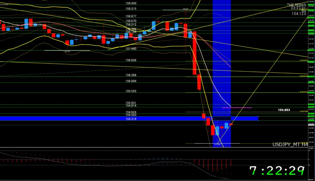 ・週明けは154円中盤まで下窓を開けてスタート!→ドル円155円20付近まで戻すも窓埋めできずに下落→153円後半まで下落