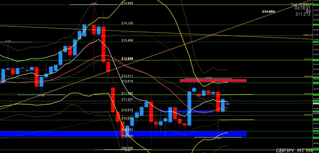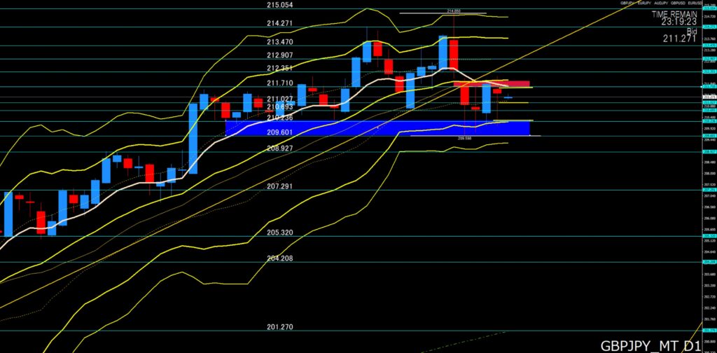 ②「トレード戦略」⇒昨日も売りが出ましたが210円前半まで下げた後は反発がしっかり、下ひげ陰線なので微妙なところなので控えめに横ばいのレンジで考えています。東京時間は下げても211円00付近でサポートされるか?上昇しても211円後半では戻り売りが出るか?211円台でのレンジをイメージして攻めたいなと考えています。