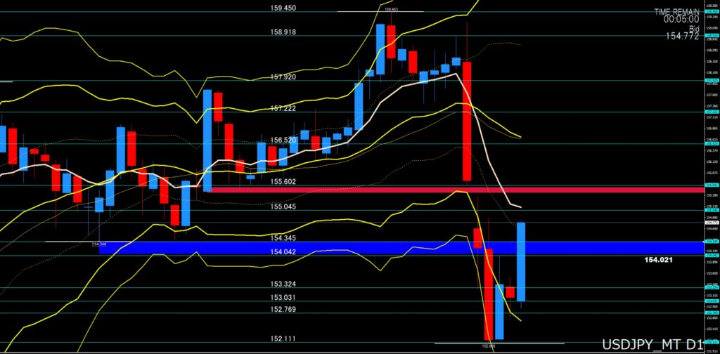 「日足の上限は155円00付近から155円50から60付近、~152円80から60付近、下限が154円50付近がサポート、割り込んできたら154円35付近、154円00付近」