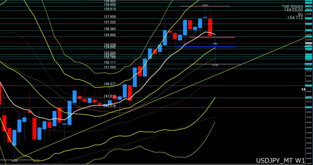 「週足の上限が155円60付近が抵抗線、超えてくれば156円台目指す展開、下限は154円前半でサポートされるか!割り込んできたら153円前半まで」