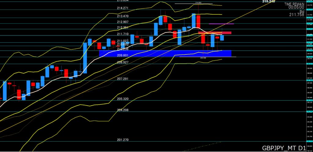 「日足の上限が212円00付近、超えてきたら212円35から40付近付近、下限が211円20から00付近、割り込んでしまると210円中盤から前半付近まで」