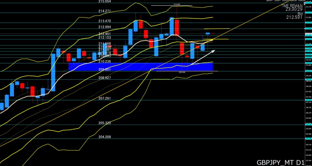 ②「トレード戦略」⇒本日も上目線、下げたら212円前半では押し目買い狙い!日足だと212円15から10付近が意識されそうで素直に反発するか?
