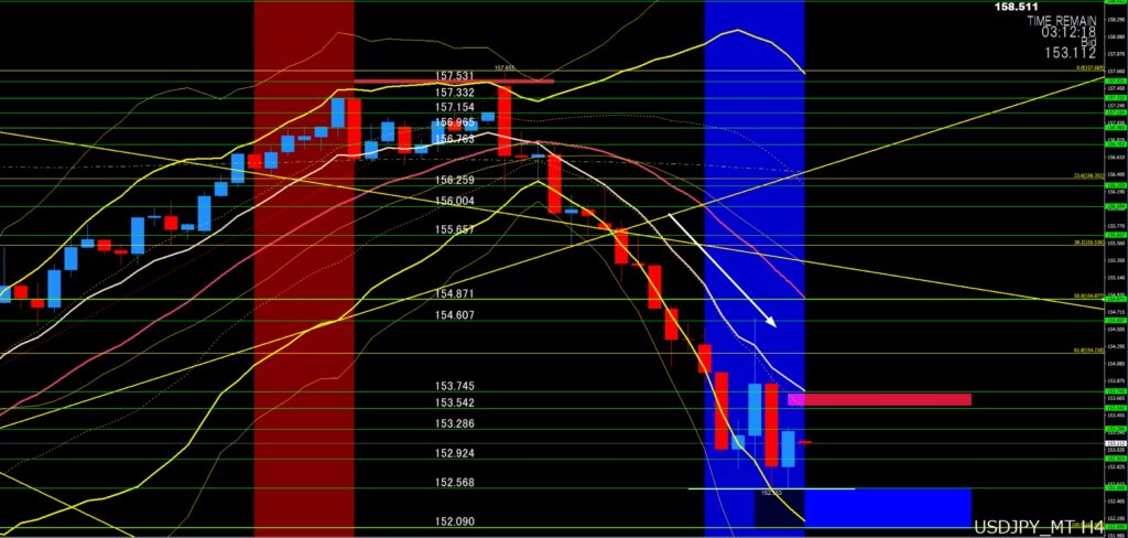 ②「トレード戦略」⇒本日も昨日と同様に下目線、下位足では戻り売り狙いで攻めたいなと考えています。素直に下げてくれたら直近の安値の152円10から00付近を目指す展開、朝の時点だとやや下げ渋っているのでどうか!?