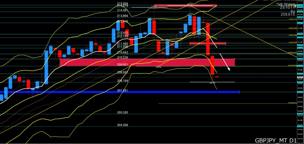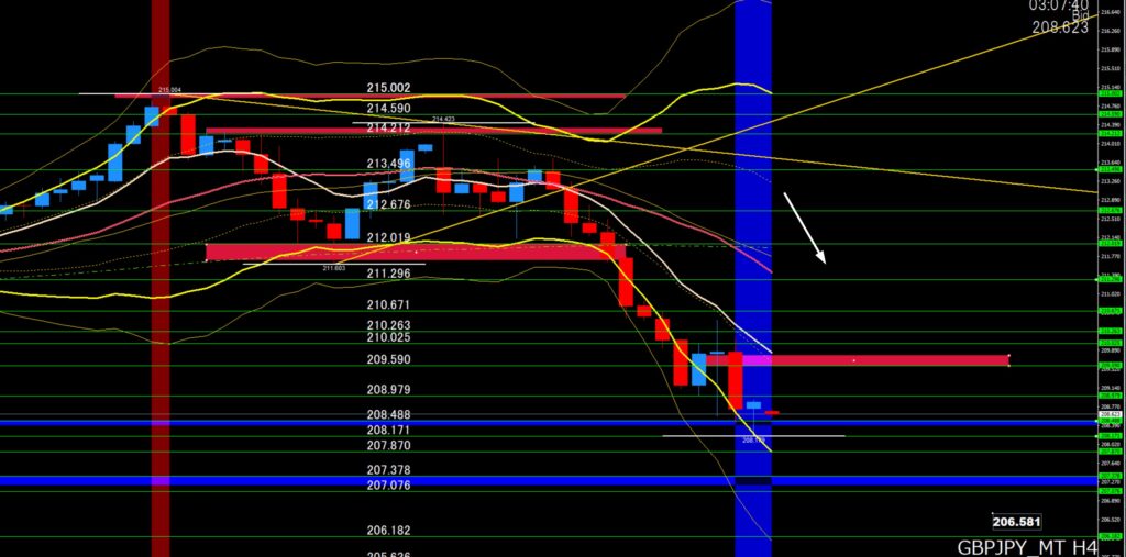 ②「トレード戦略」⇒ボリンジャーバンドが下向きでバンドウォーク展開で売り優勢、下げたところで横ばい状態、買いが弱めの状況、ただ下ひげ陽線が確定していますので買戻しの流れになる可能性もあり208円80付近を超えてきたら買戻しの流れも検討して攻めたいなと考えています。ただ日足の上値ポイントが208円95付近、209円00付近、209円20付近にありますので追っかけるのも注意!