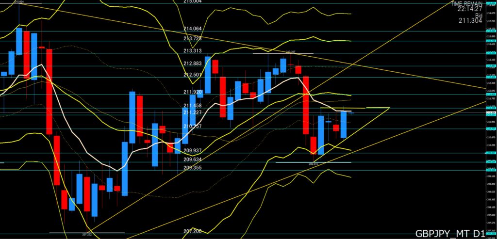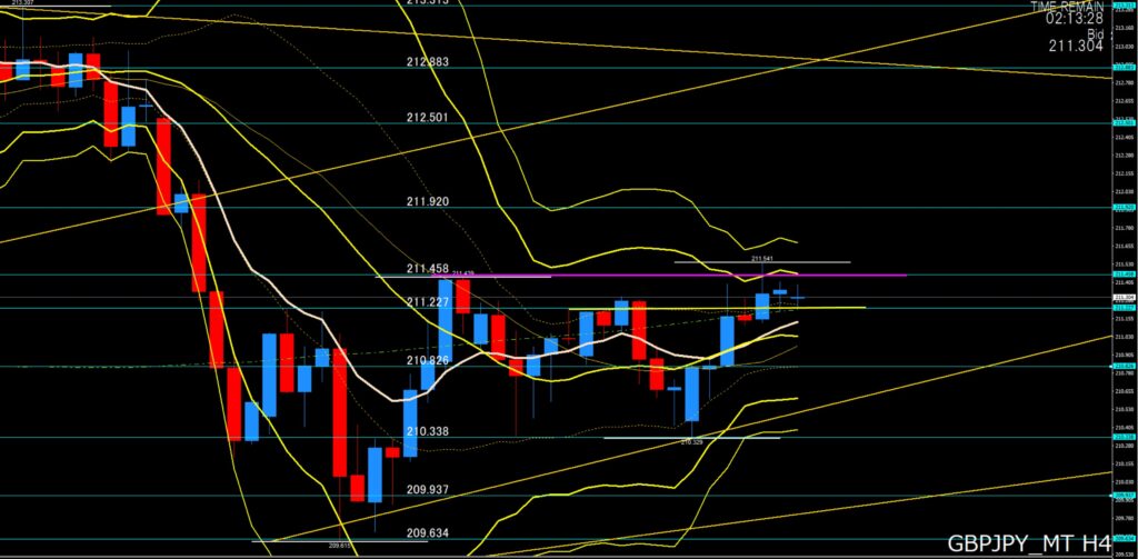 4時間足:ボリンジャーバンドがスクイーズ状態、横ばいのレンジになるか?このまま211円50台を超えて上昇するかの局面、211円20から00付近がサポートであれば上目線より