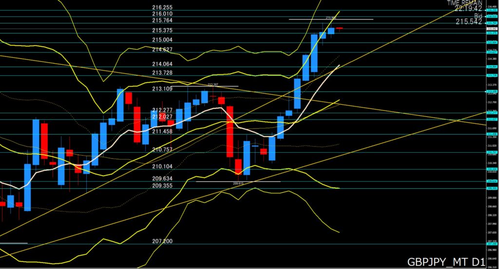 4時間足:ボリンジャーバンドと移動平均線が上向き、やや横ばいになってきていますので高値圏でのレンジも想定、下げても215円前半では押し目買い、上げてきたら215円台乗せてくるか?