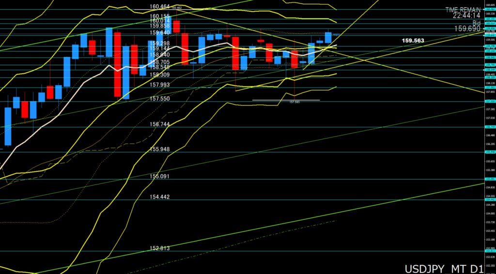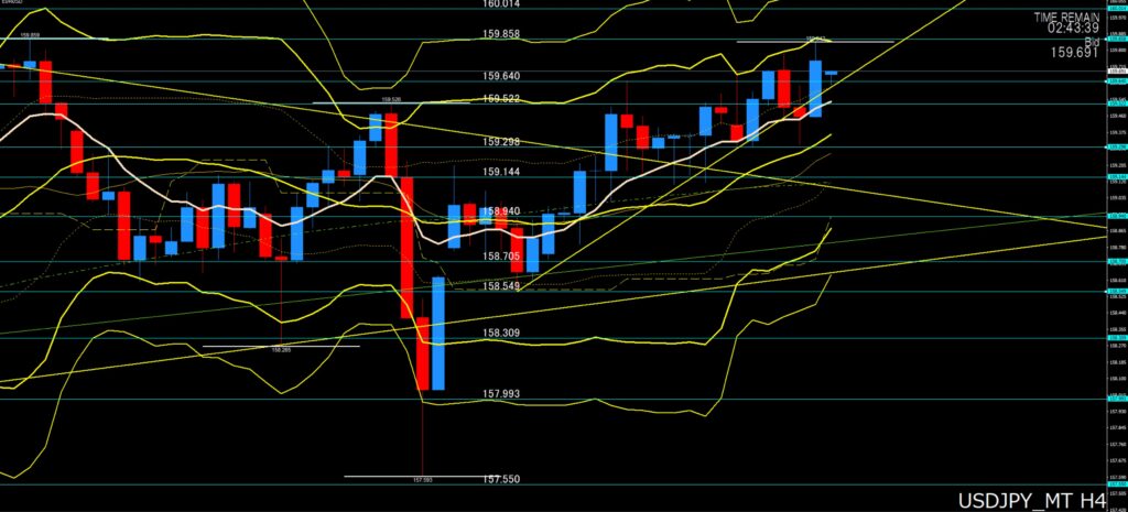 トレード戦略:本日は、159円中盤から後半でのレンジを意識して攻めたいなと考えています。押し目買いポイントとして、浅ければ159円60付近、159円52から50付近、159円40から35付近を意識しています。