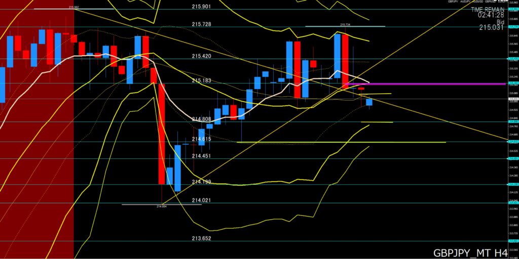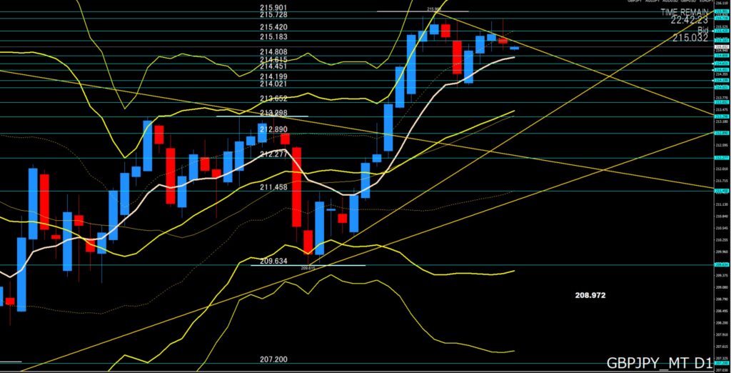 4時間足:4時間足だと、ダブルトップからの下落で戻り売りが優勢、上値ポイントは、215円18から20付近、ここが抵抗線になって上値が重ければ下目線、超えてきても215円35付近でも戻り売りに注意、あと下げてもボリンジャーバンドがスクイーズしていますので下値ポイントでは下げ渋りそう。