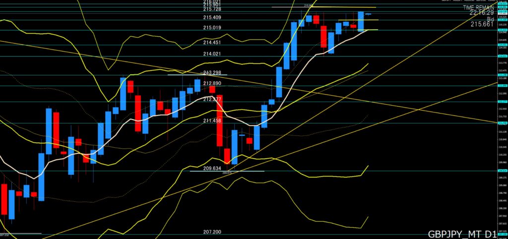 日足:ポンド買いが優勢、横ばいから上目線で高値更新して216円台狙ってくるか!日足の下値ポイントは、215円40付近、215円05から00付近